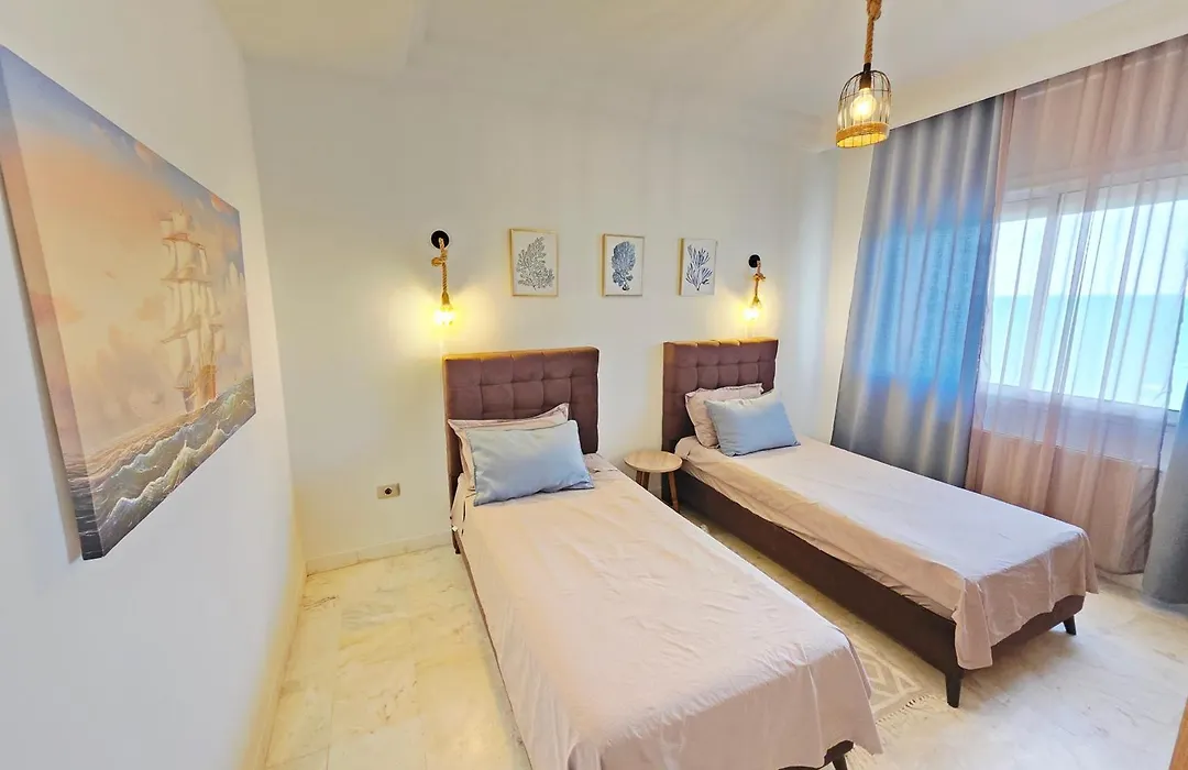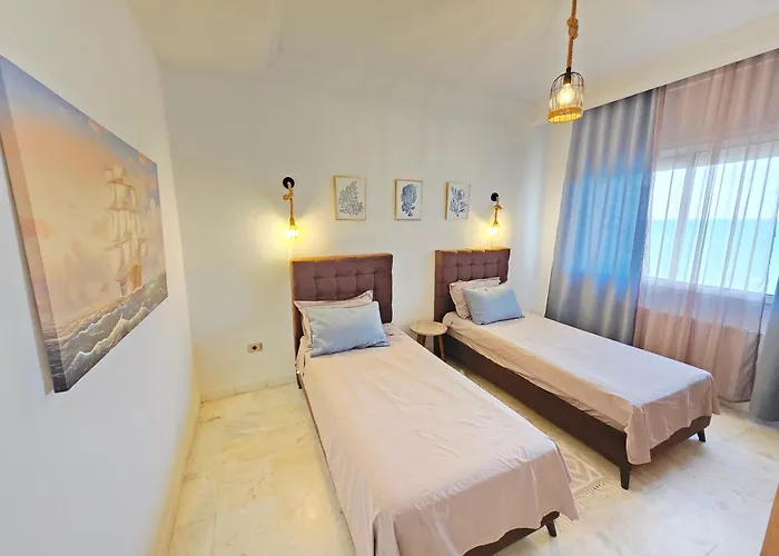 The beachfront The Bleu Sea Apartment Tunis is located in Tunis, 25 minutes' walk from the National Institute of Marine Sciences and Technologies Museum, and pampers guests with a Turkish steam bath and a Jacuzzi. Along with currency exchange and a lift, the spacious apartment offers a free private car park on site.